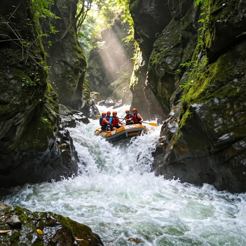龙王山峡谷漂流采用2人皮艇,全长2公里,漂流时间约1小时40分钟。河道从起点到终点落差达100多米,河道溪水清澈见底,各种巨石散布其中,火山遗迹清晰可见。途经20多处滩、30多道湾、40个滑道、峰回路转,有惊无险。漂流过程中穿石绕壁、急流险滩让你在惊险刺激中体验全程的乐趣。